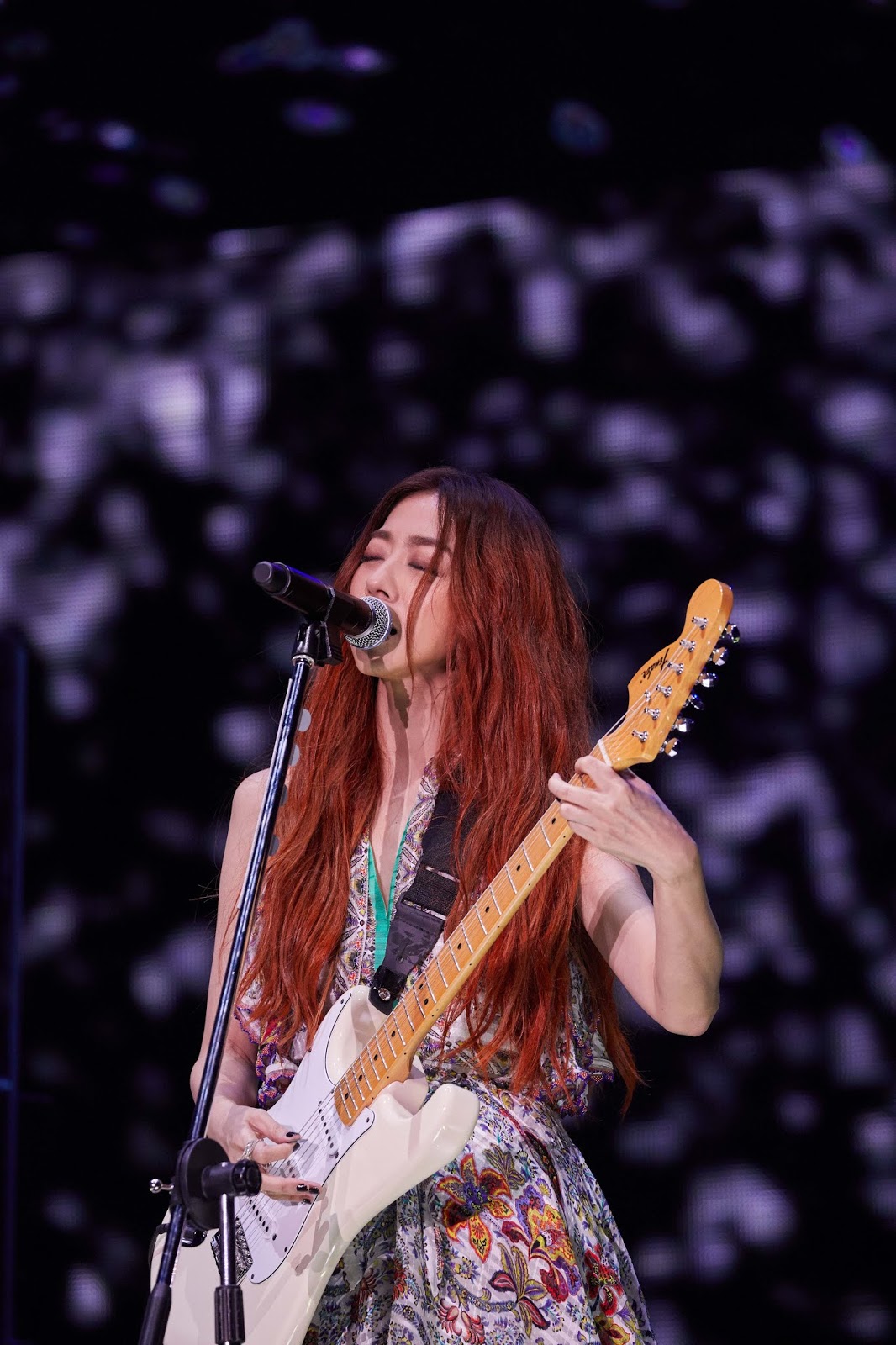 回到舞台中央,陳綺貞繼續帶來屬於她的迷幻搖滾色彩,無論是探討生命起源的《腐朽》,還是封閉自我內心世界《Sentimental Kills》,又或是經典搖滾主打《躺在你的衣櫃》,一連三首強而有力的歌曲,隨著舞台巨型LED螢幕上下移動,加上燈光視覺投射,完整剖析陳綺貞20年來的內心獨白。中場休息前夕,現場特別播放一支VCR,陳綺貞穿上空服員制服、綁起包頭,化身空姐驚喜現身,詳細解說演唱會的流程跟內容,這段影片正是復刻她2003年舉辦「吉他手」演唱會的其中一段造型,俏皮逗趣模樣,也歌迷力讚「凍齡」,絲毫沒有太多變化。