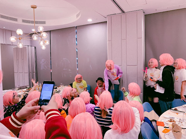 只見現場約四十人參加的春酒頓時成粉紅色的Bonnie派對,無論男男女女每位都要頂著粉紅色假髮在海鮮餐廳吃著佳餚,效果”吸睛”之餘還引起餐廳服務人員及其他客人側目及駐足觀賞;有趣的是,有許多未曾留過長髮造型的男性賓客邊吃海鮮邊撩頭髮,滿頭大汗的模樣令人發噱,苦笑直喊:「吃鬼鬼這頓感覺像在懲罰啊!」